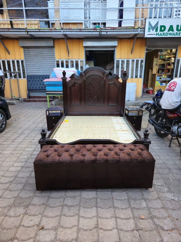 5×6 Dark brown castlehead hardwood bed with side drawers and ottoman